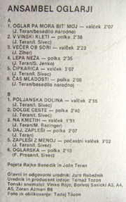Oglar pa mora bit' moj (J.Teran/besedilo narodno) V vinski kleti (J.Teran/I.Sivec) Večer ob Sori (J.Ziherl) instrumental Čas mladosti (J.Teran/besedilo narodno) Poljanska dolina (J.Teran/I.Sivec) Na kmetih (J.Teran/M.Razinger) Daj, zapleši (J.Teran) instrumental Zapleši z menoj (J.Teran/I.Sivec)